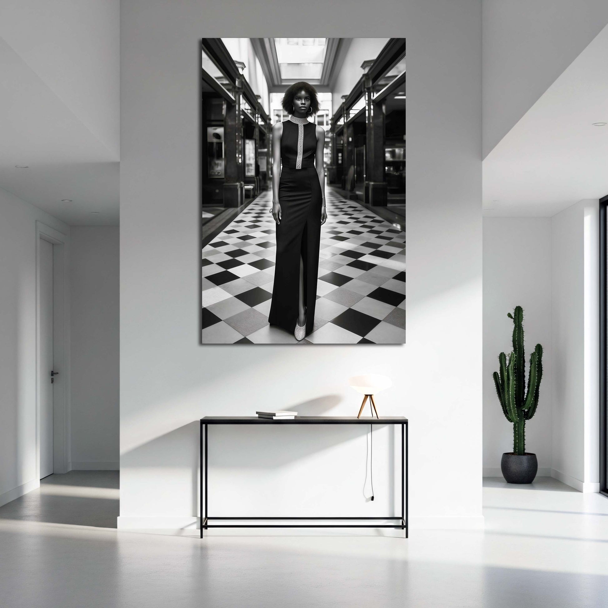 Frau Mode schwarz weiß elegantes Kleid Galerie Architektur Wandbild