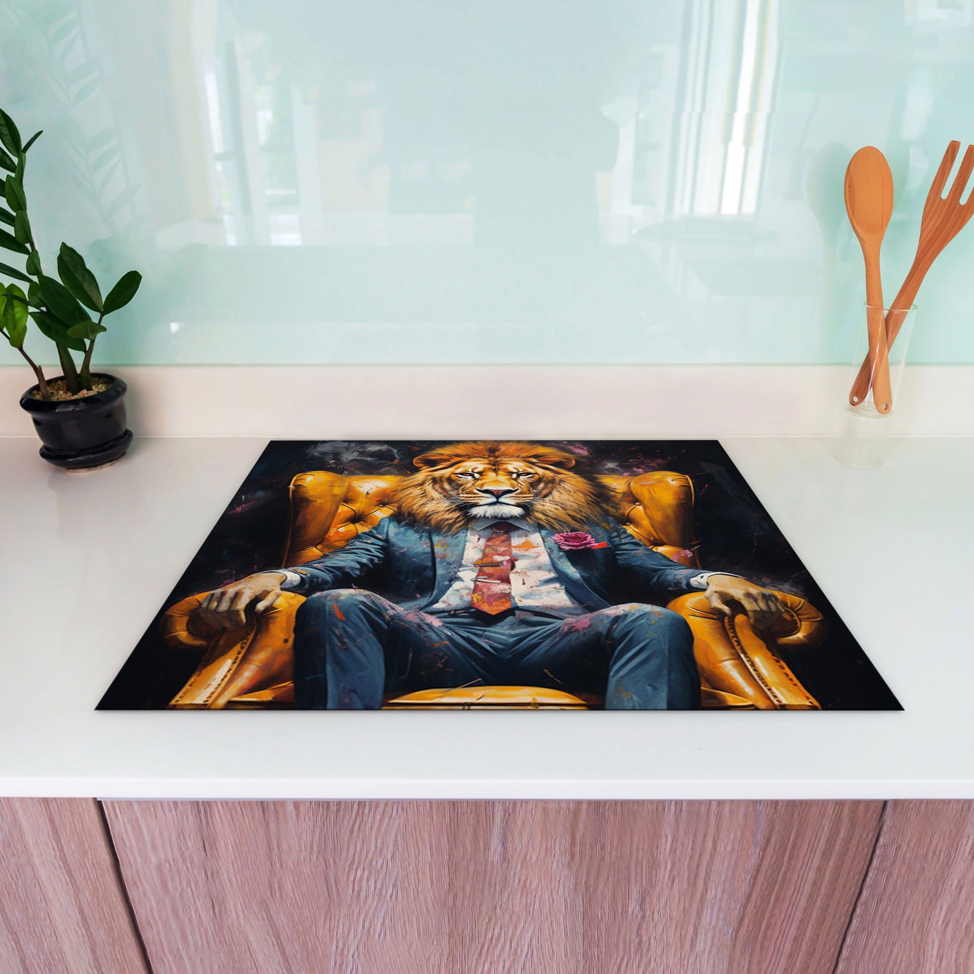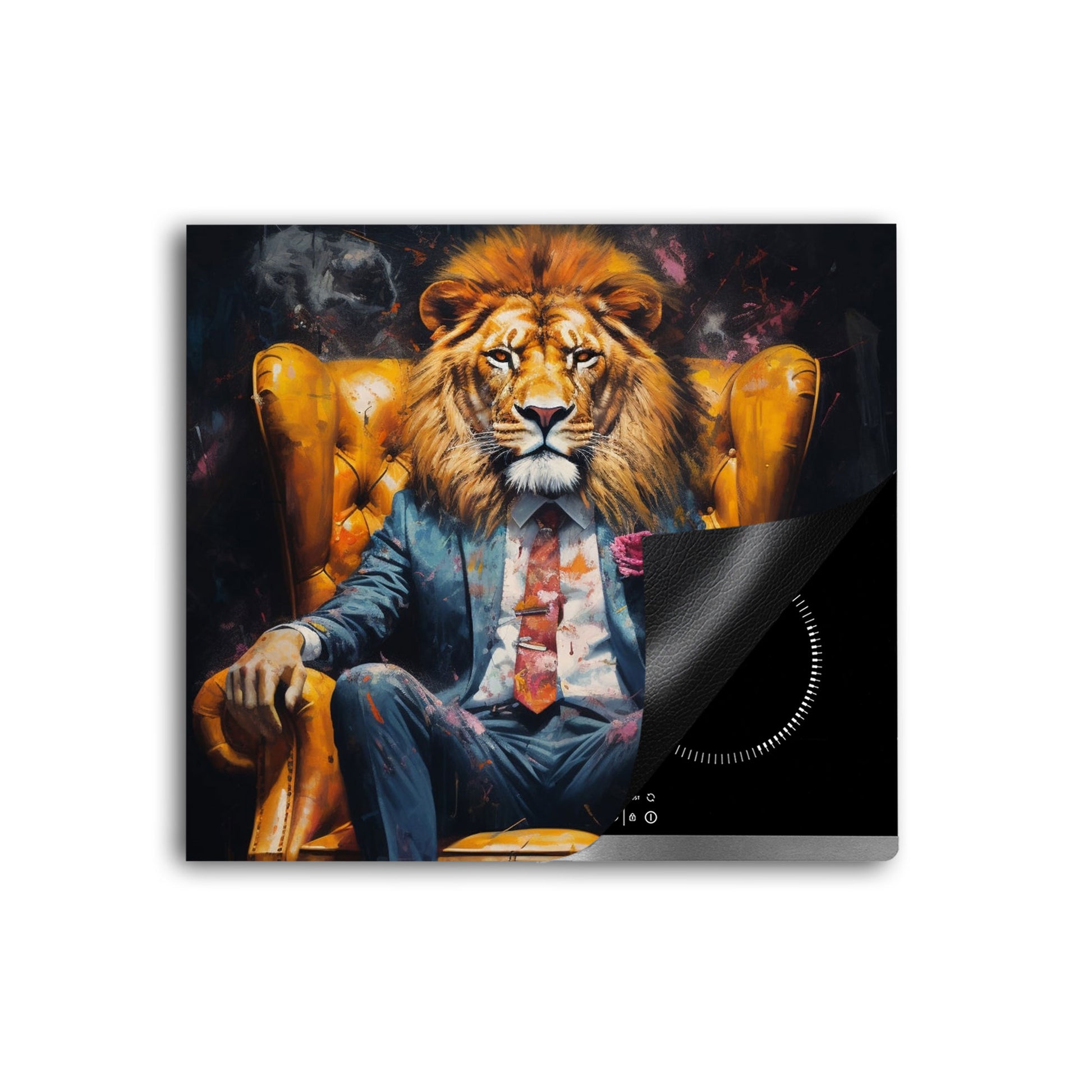 Löwe im Anzug im Sessel Herdabdeckplatte Induktionsschutz für Ceranfeld & Küche Deko
