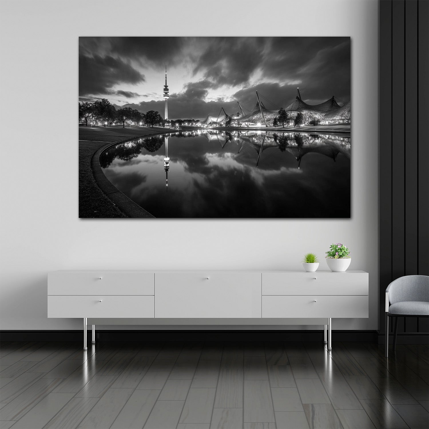 Olympiaturm München Seeufer schwarz weiß Wandbild