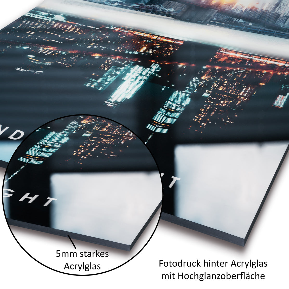 • Acrylglas (5 mm) – mit glänzender Oberfläche und 3D-Tiefenwirkung.