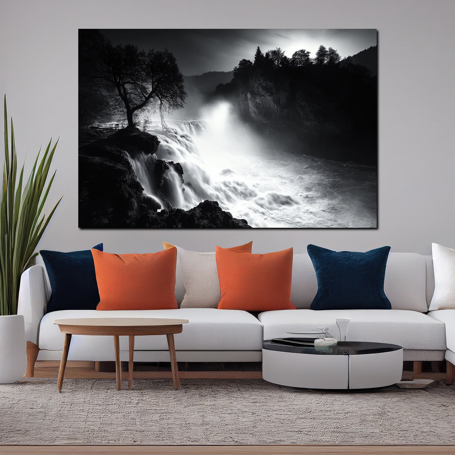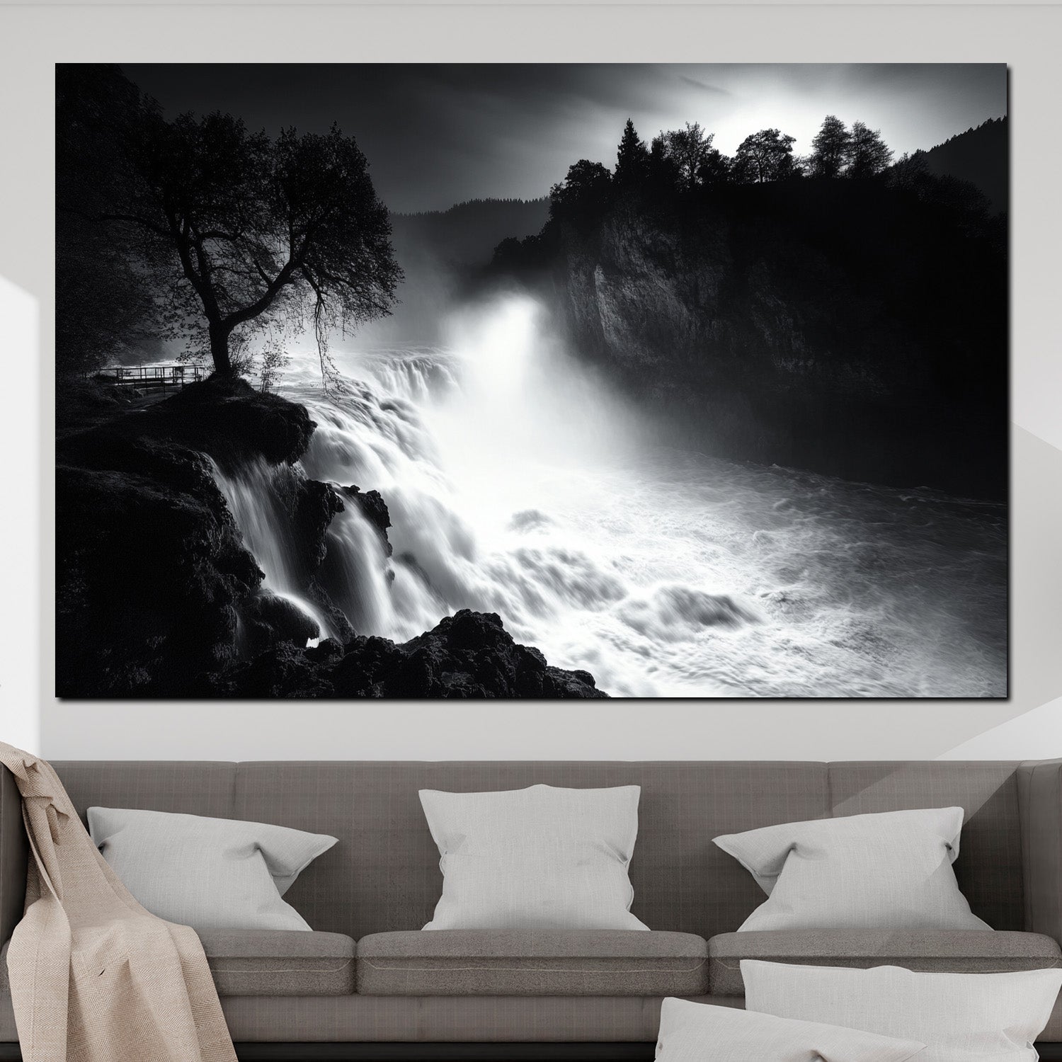 Wandbild Natur Wasserfall schwarz weiß Landschaft Felsen Baum Lichtspiel